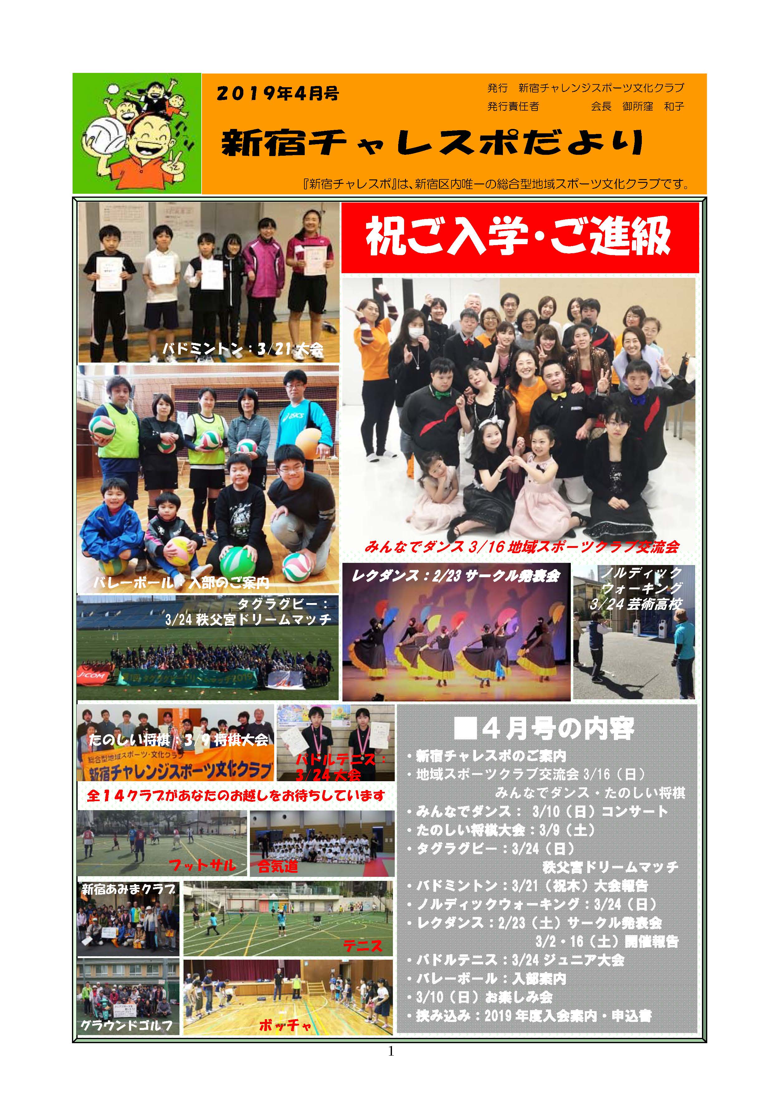 新宿チャレンジスポーツ文化クラブ(通称:新宿チャレスポ)では、誰もが行きたいスポーツ・文化活動を自由に選択できるとともに、各種のイベントなどいろいろな形で楽しむことができます。内輪で楽しむ「私益」ではなく、地域住民に開かれた「公益」を目指しています。 総合型地域スポーツクラブの主役は「地域」の住民の皆さんです。「地域」の皆さんが育み、発展させていくのが総合型地域スポーツクラブ、すなわち「新宿チャレスポ」です。 友達・会社の同僚などを誘って、どんどんご参加ください。