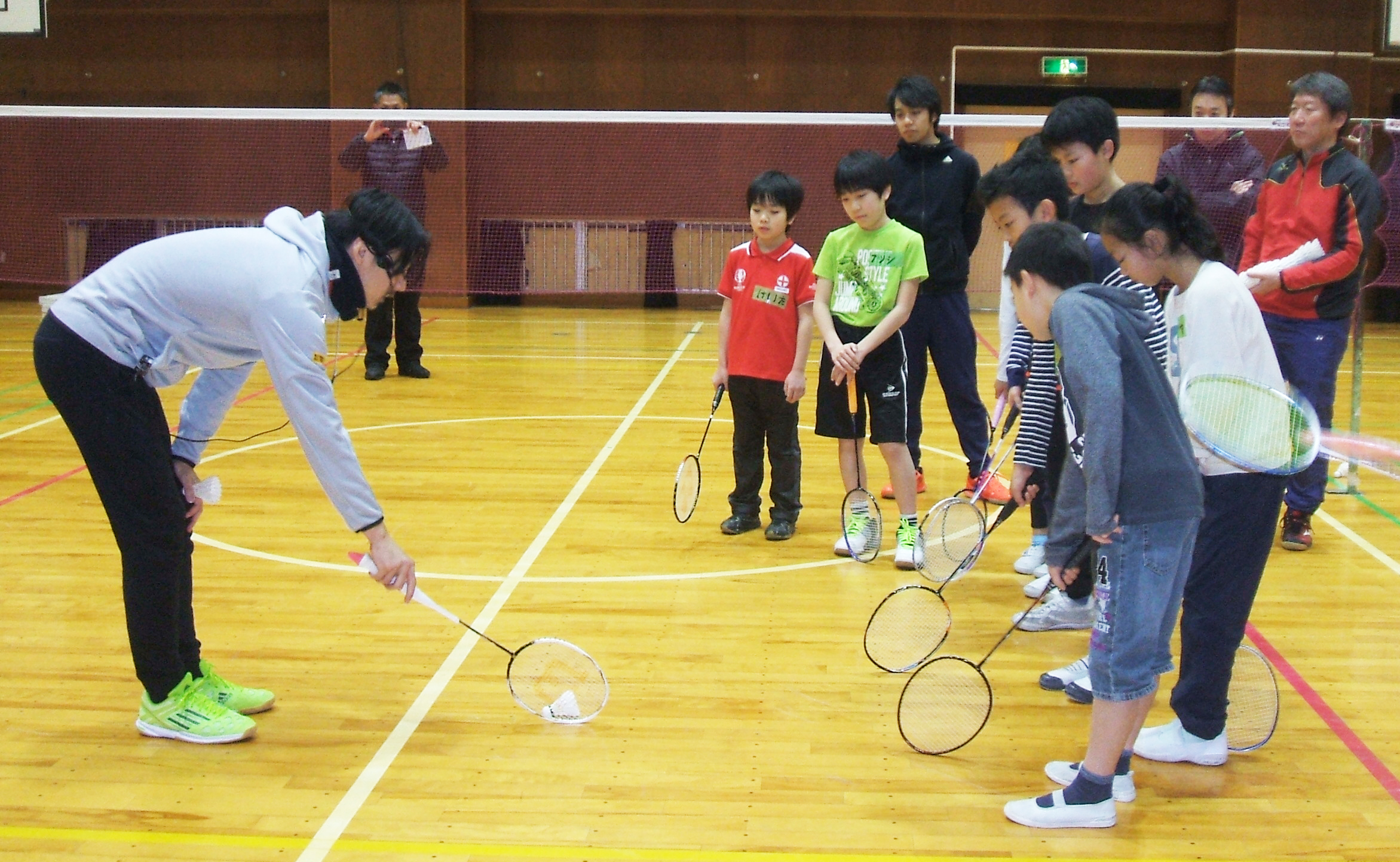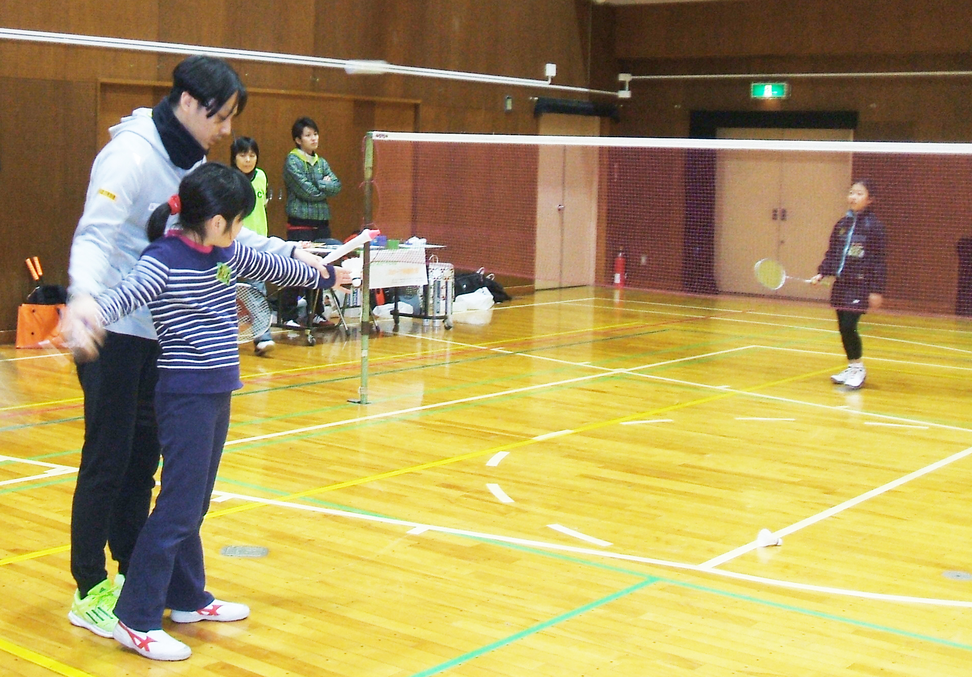続いてはサーブ。こちらもかなり個人差があり、初めてラケットを握る子はラケットに当たらなかったりもしましたが、写真のような丁寧な指導。オリンピアンに手取り足取りの指導ですから、本日一日でかなり上達したと思いますよ。"先生ステキ!!"という声が聞こえてきそうですが、この後はシャトルをネット越しに出してもらってのフォアとバックの練習。お手伝いの大人からのシャトル出しなど、ご協力いただいた皆様には改めまして大感謝です。池田先生自身は、巡回しながら、適切な声掛けと、時には自ら指導などこちらも実に丁寧な指導でした。ということであっという間の1時間半。池田先生、時間オーバーして関係者に止められるまで、熱心にご指導いただき本当にありがとうございました。
