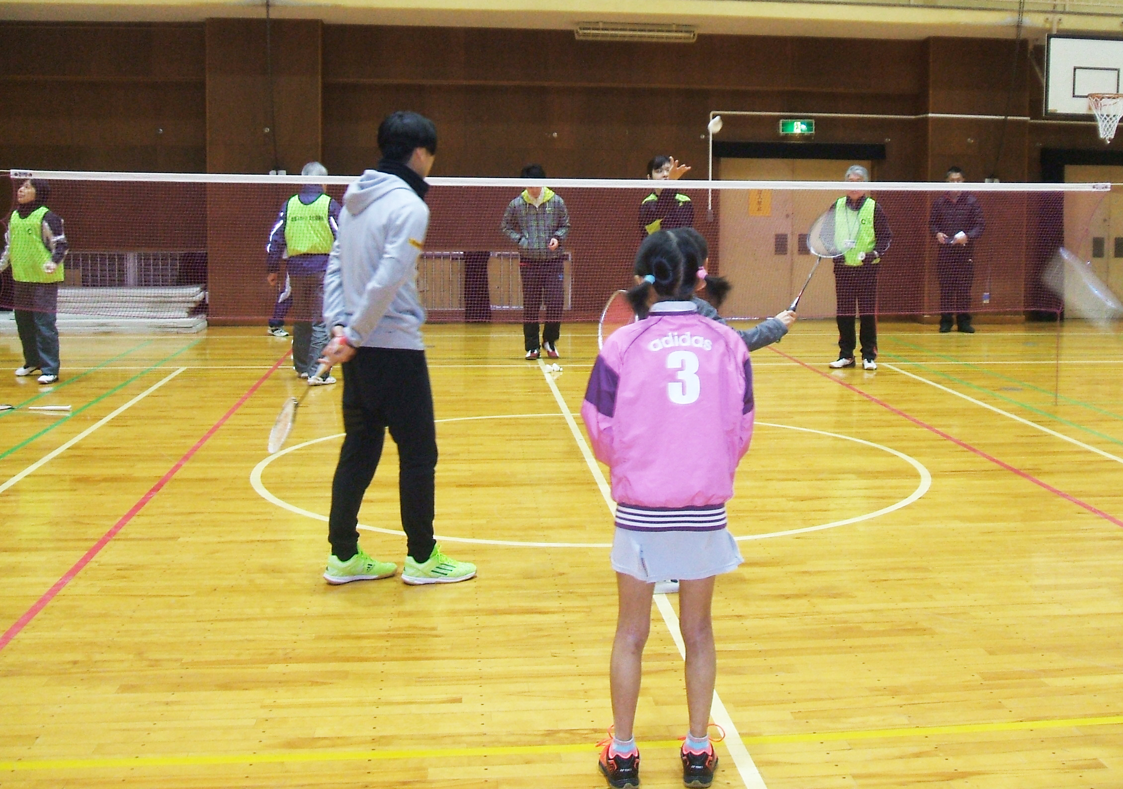 1/7土曜日13:00-14:30富久小体育館で、"トップアスリートに学ぶ スポーツ体験教室"の第1回として、バドミントンの池田信太郎コーチをお迎えしてバドミントン教室を開催しました。