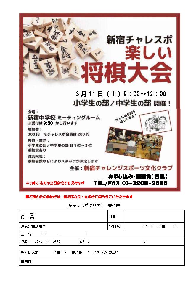 3月11日土曜日9:00-12:00、新宿中ミーティングルームで"楽しい将棋大会"が開催されます。
