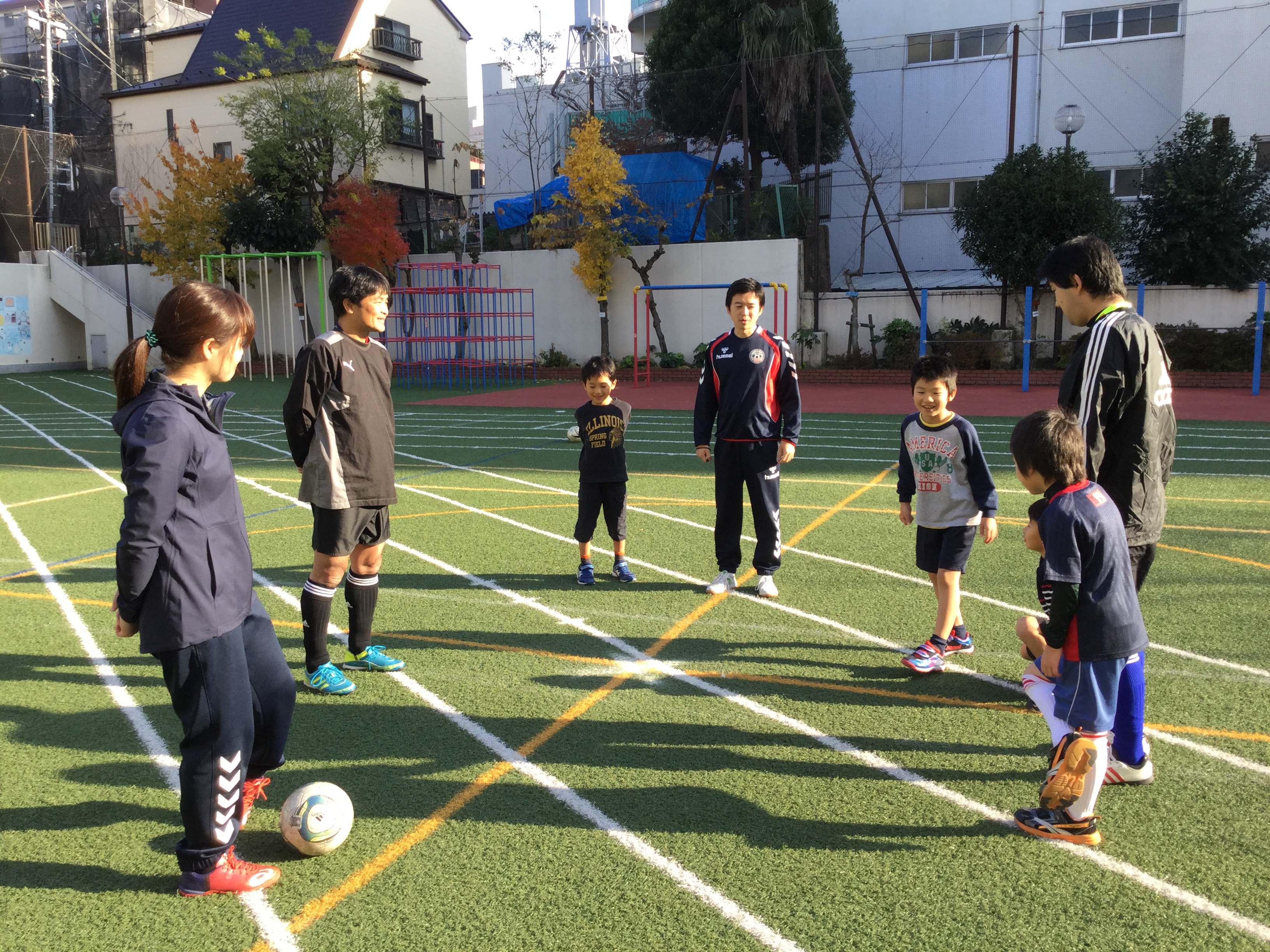 12月2日午後富久小にて、フットサルが開催されました。天気も良く、大人5名、子供は未就学児2名含む6名の参加。写真1枚目では集合してあいさつして試合の前。さすがに未就学児2名はこの輪に入れず、取材をしているわたくしオカパーと一緒に遊びましたが...。写真2枚目はということで試合の風景。自分の子供でない大人が3人、自分の子供がいる親が1名という構成なんですが、大人の皆さん子供に合わせて楽しんでプレーです。本当に子供好きないい人ばかりですかね。子供はのびのびとボールを追いかけて楽しそうでした。