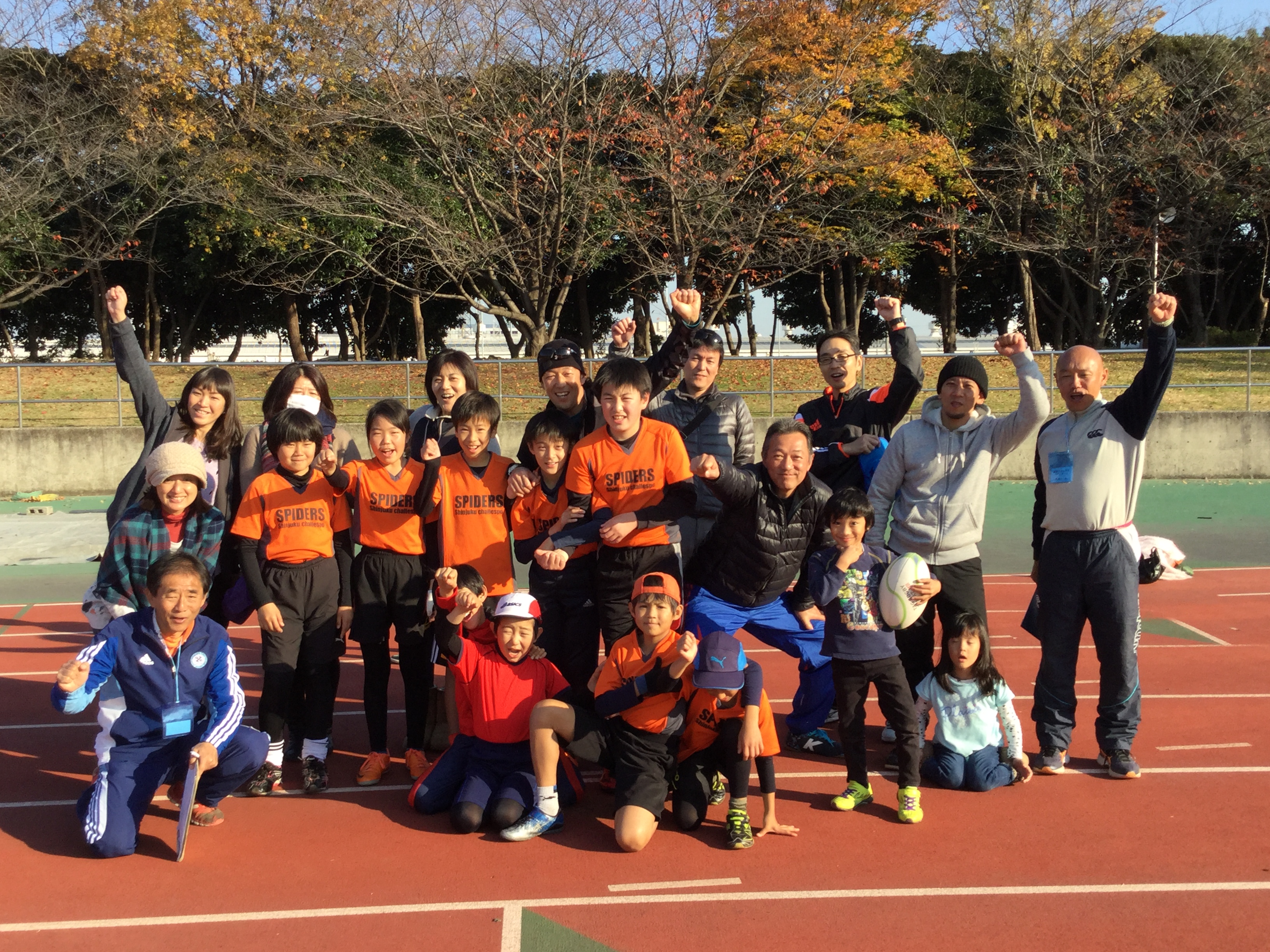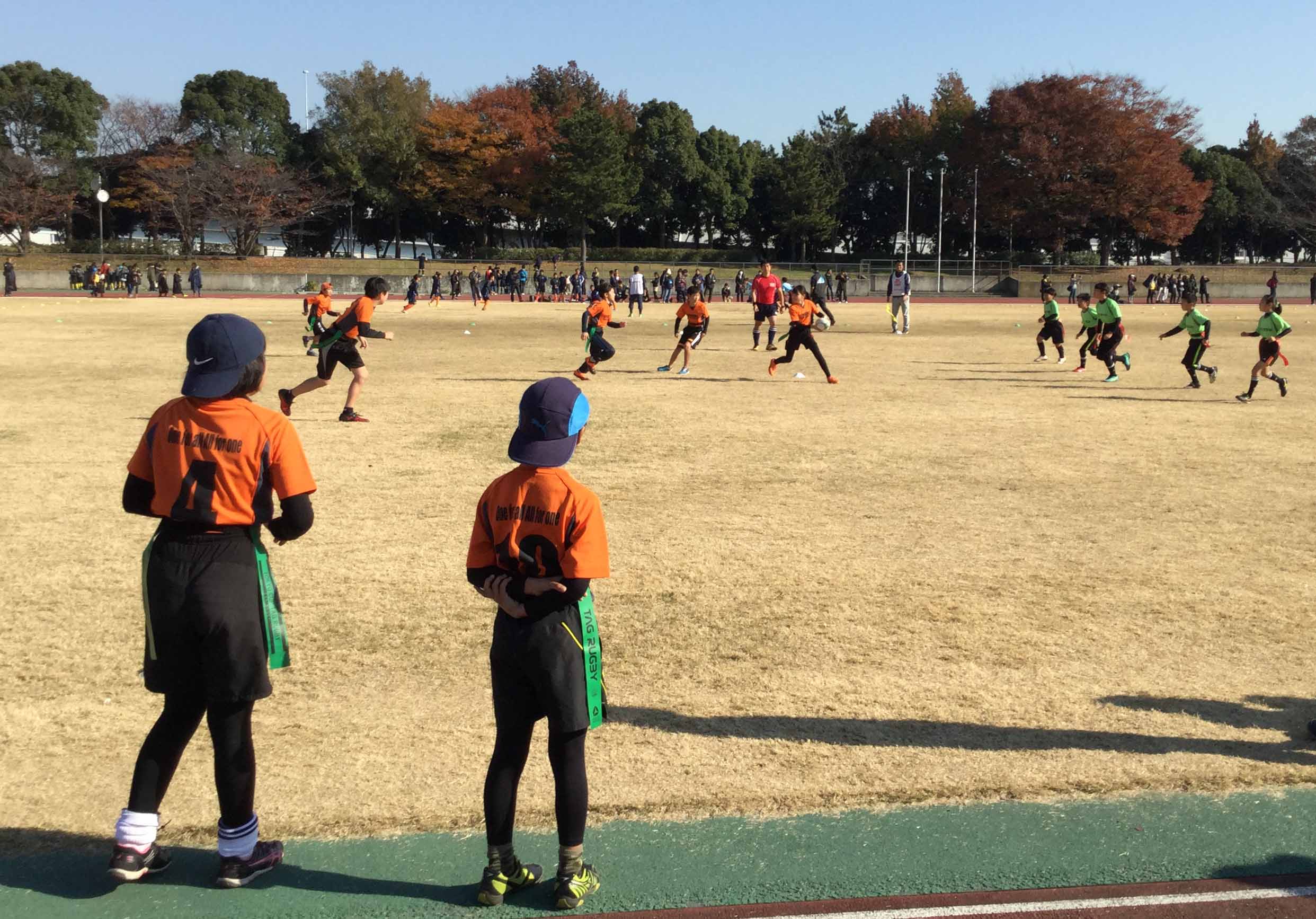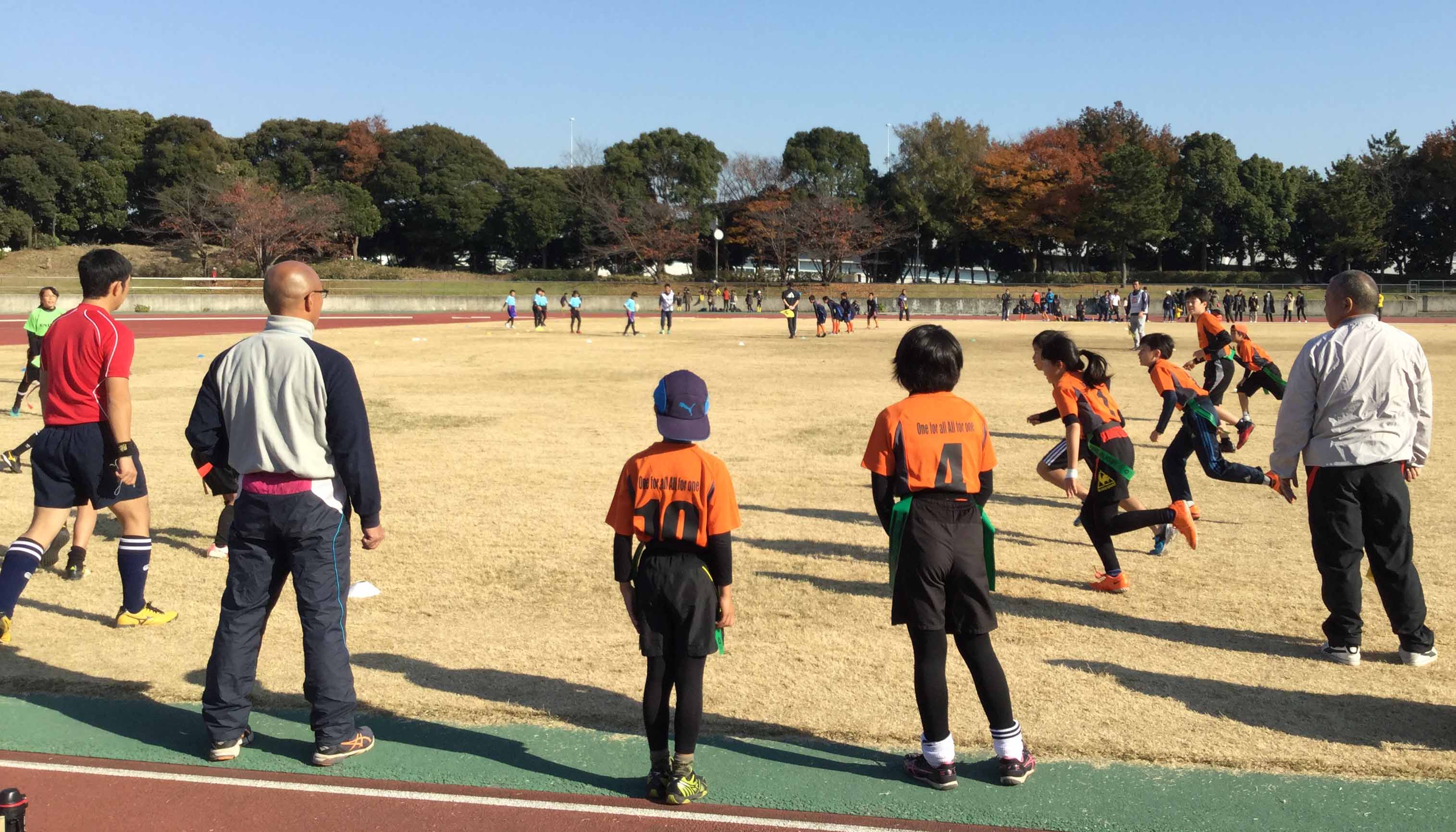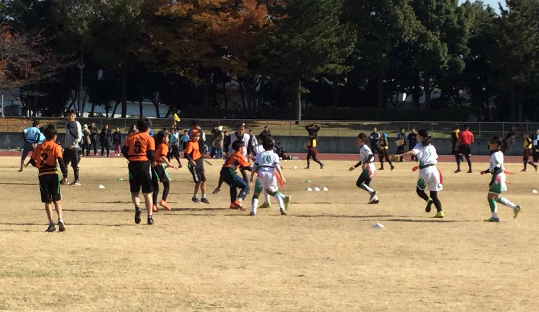 12月3日日曜日大井ふ頭中央海浜公園スポーツの森陸上競技場において、2017年度サントリーカップ大井ラウンド(最終予選)が行われました。11/19が府中、26が日野と今年の予選会はエリアごとではなく、勝ち抜けで決まっていく方式でその最終予選が今回大井ラウンドでした。1っ発勝負よりチャンスは広がっているようにも思いますが、3週連続の予選ということで、同行いただいた保護者の皆様の疲労もいかばかりか、まぁ、代表大会に行って戦うより沢山の試合ができたことはタグラグビーを十分に堪能できたと、好意的には言えなくもないですかねー...。