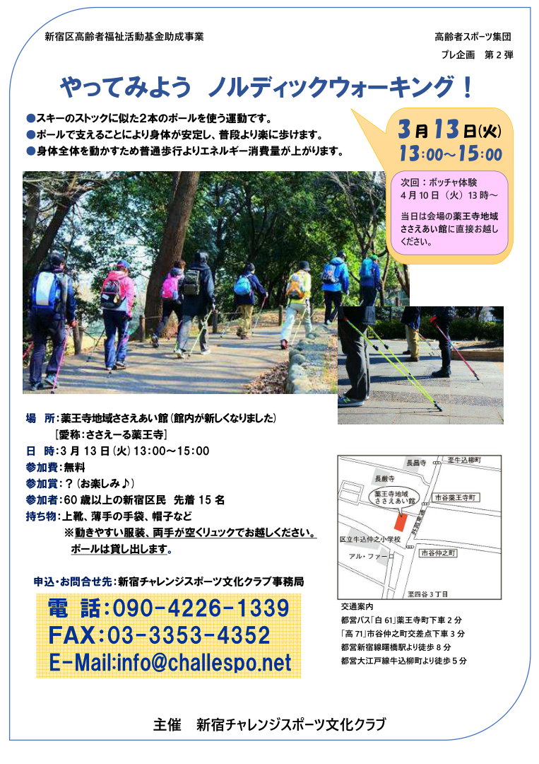 3月13日(火)13時~15時からはノルディックウォーキングを開催します。 また、次回のボッチャは4月10日(火)開催です。 60歳以上のシニア世代の方、ぜひご参加ください!
