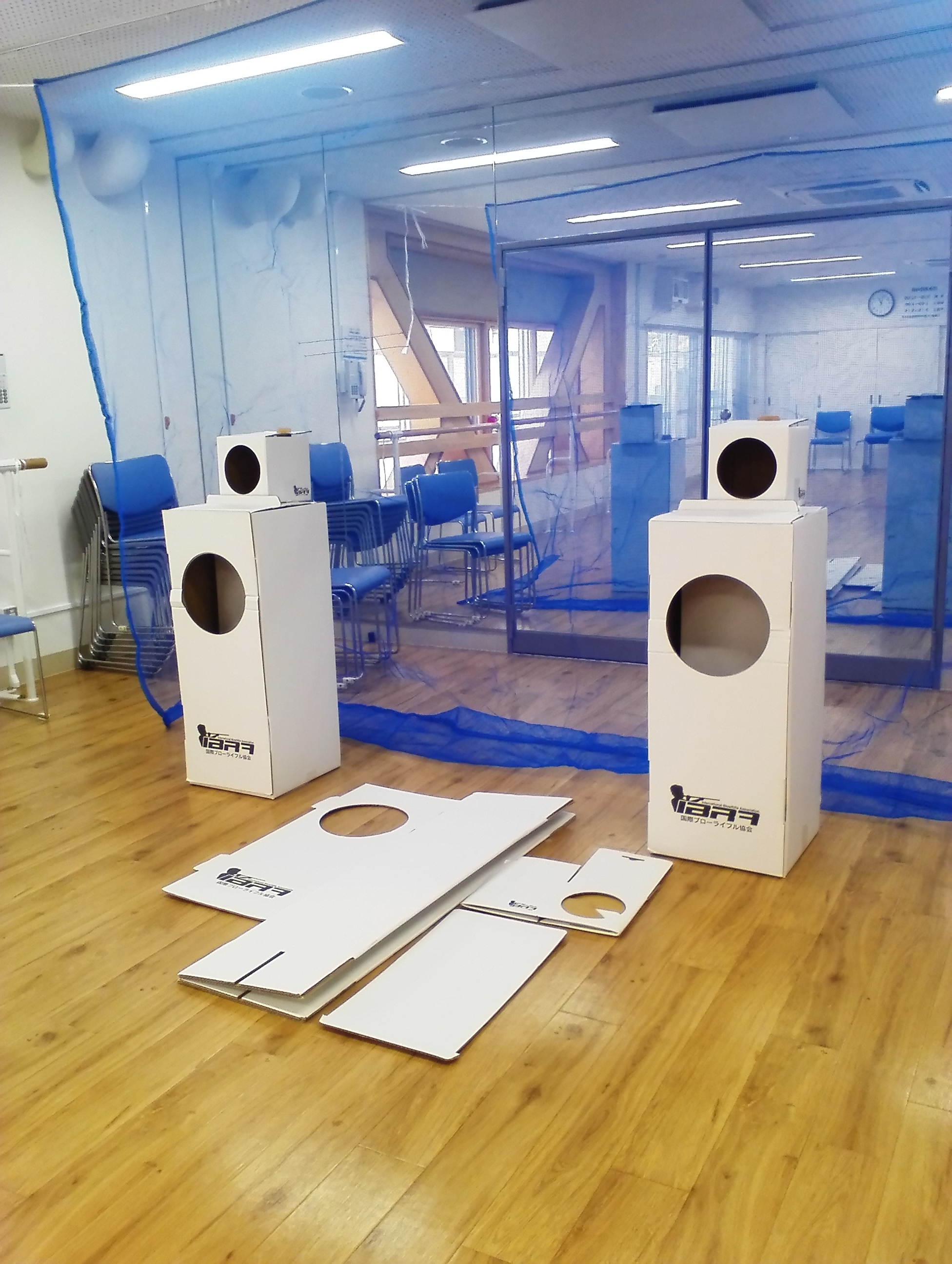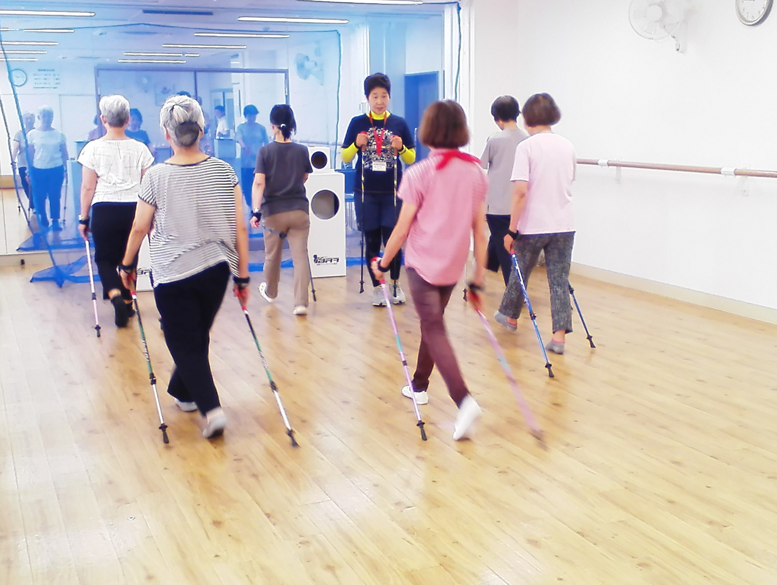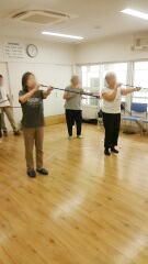 スタートは薬王寺地域ささえあい館でのブローライフルでした。普段はノルディックウォーキングもやっている日なので、最初はノルディックウォーキングポールを使ったウォーミングアップや筋トレ、レクチャーを行なったあと、お楽しみのブローライフルです。